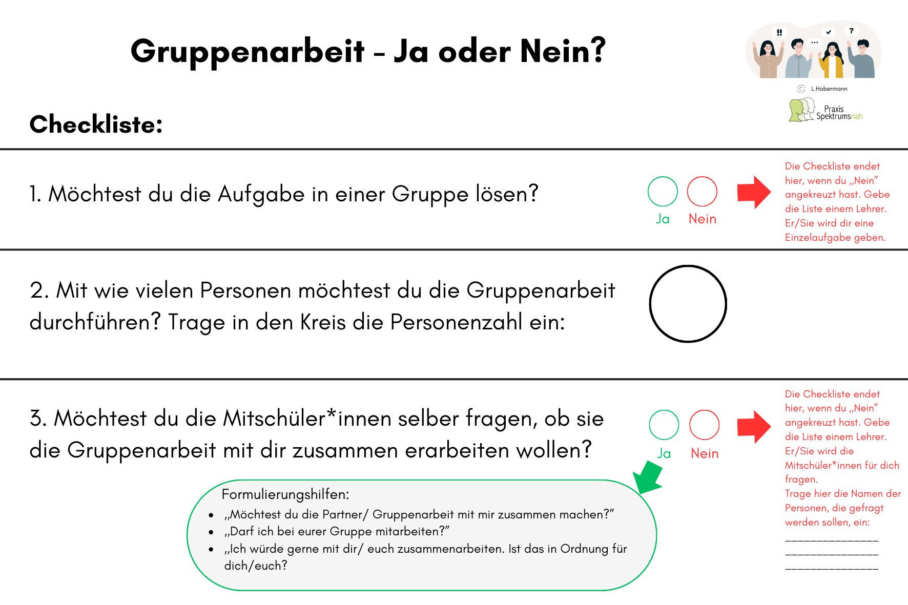 Die Checkliste für Kinder und Jugendliche für eine selbstbestimmte Bedürfnisäußerung zur Teilnahme an einer Gruppenarbeit im Kontext Schule: